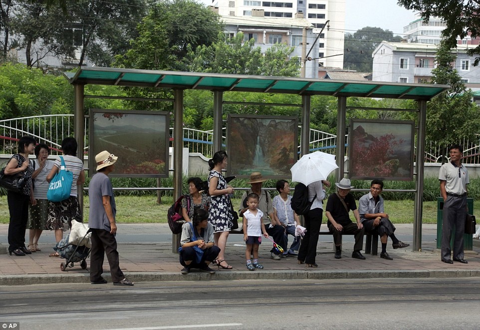 | Người dân gồm người già và trẻ nhỏ chờ xe buýt tại một điểm đỗ ở thủ đô Bình Nhưỡng. Ảnh: AP |