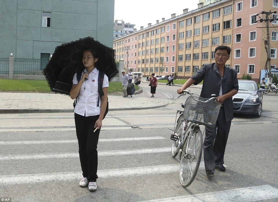 | Người dân Bình Nhưỡng di chuyển qua đường. Phía sau họ là một xe ôtô bóng loáng. Tắc đường là chuyện hiếm khi xảy ra tại Triều Tiên. Ảnh: AP |