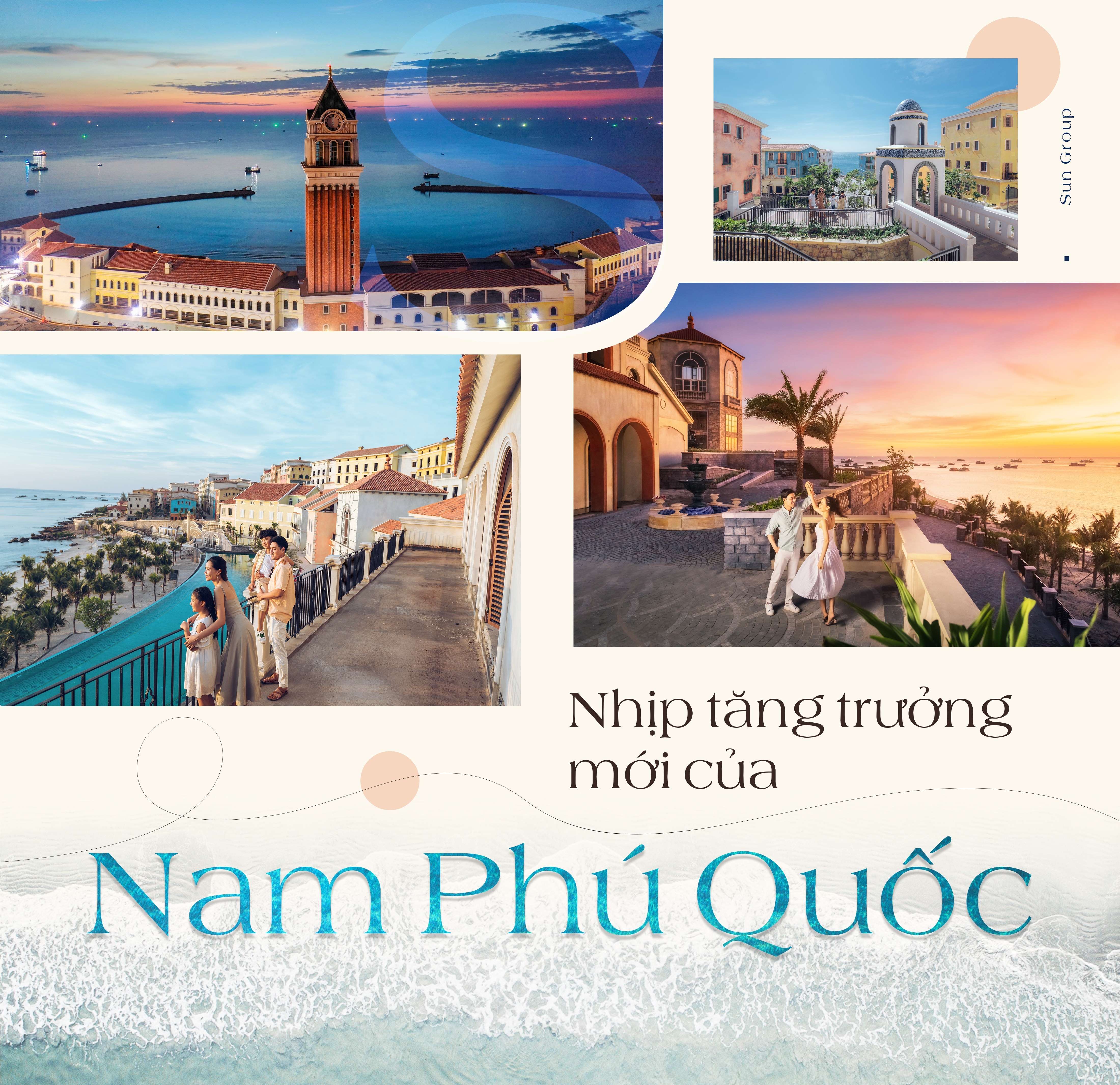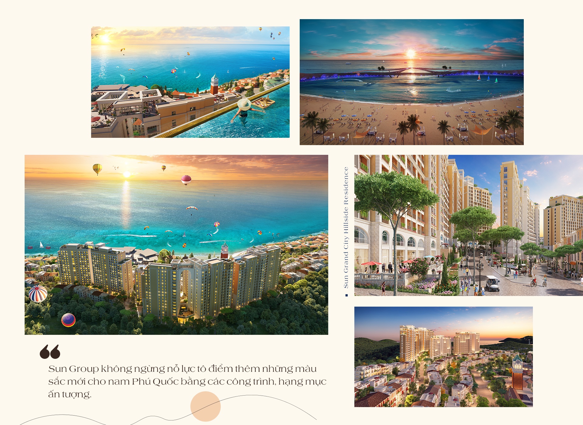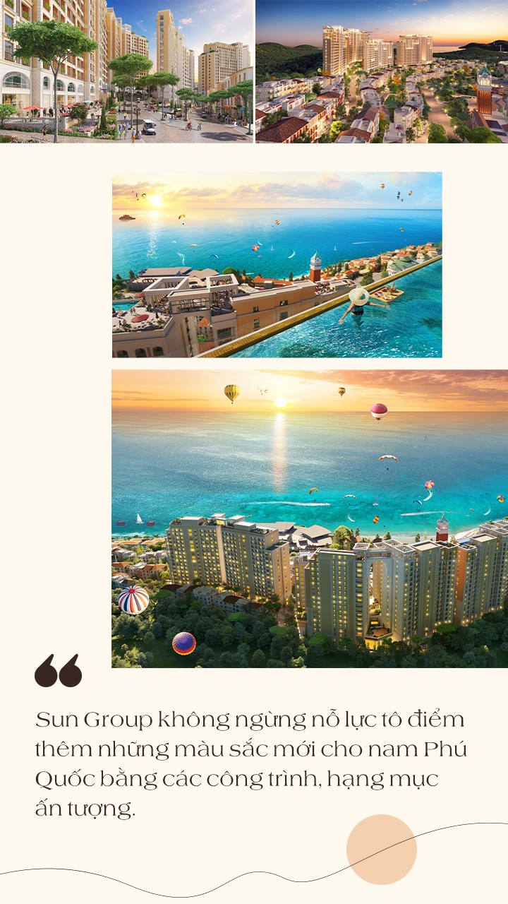 Trong bức tranh toàn cảnh của nam đảo, Sun Group không ngừng nỗ lực tô điểm thêm những màu sắc mới bằng các công trình, hạng mục ấn tượng. Trong đó phải kể đến tổ hợp căn hộ cao tầng đầu tiên tại Phú Quốc - Sun Grand City Hillside Residence, show trình diễn nhạc nước Vortex lớn nhất thế giới, cầu Hôn - một trong những điểm ngắm hoàng hôn đẹp nhất đảo ngọc. Ngoài ra, Central Village - trung tâm của Sun Premier Village Primavera sẽ quy tụ những nhà hàng, khách sạn, dịch vụ F&B độc đáo, góp phần thắp sáng kinh tế đêm tại nam đảo…