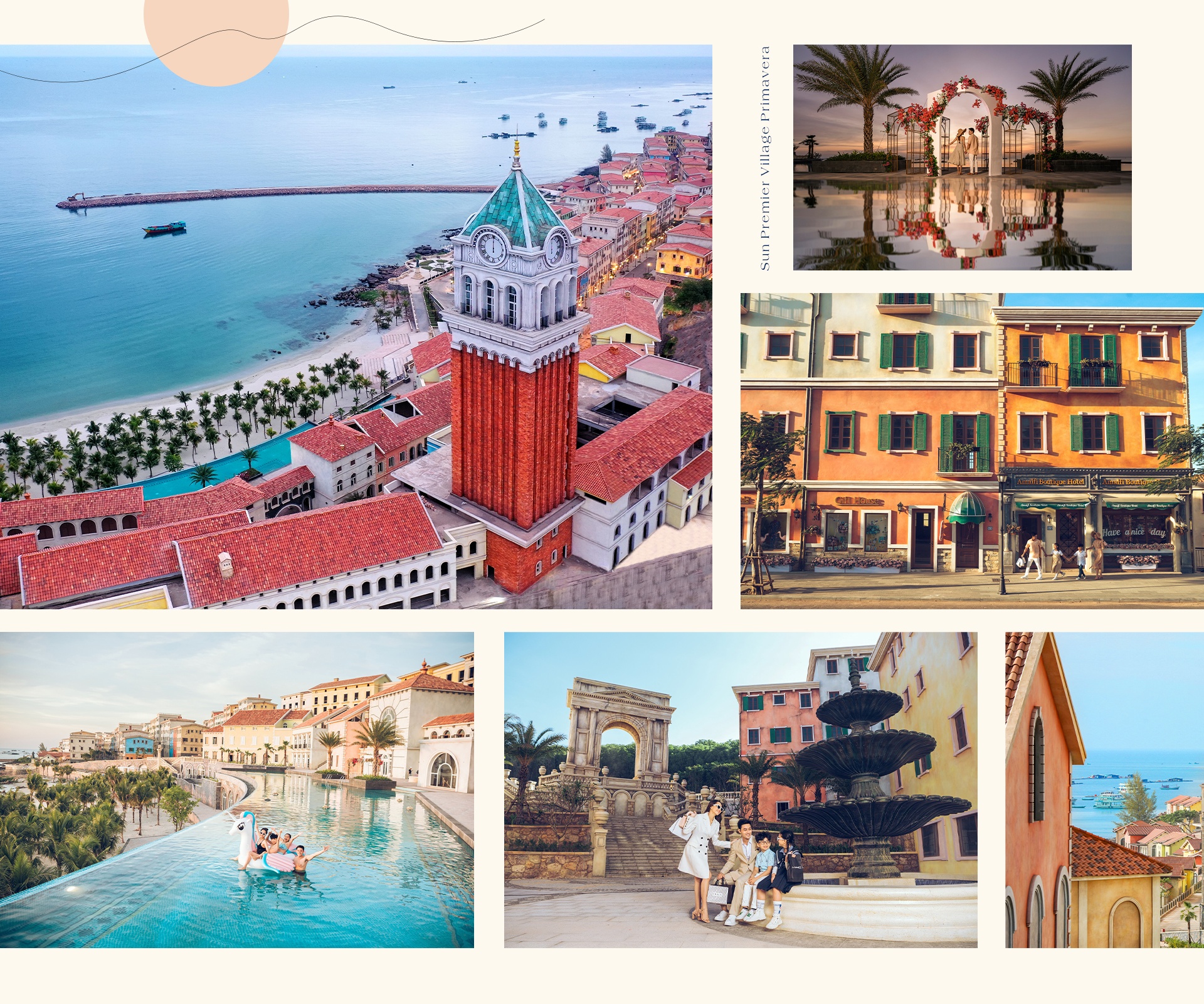 Tổ hợp thương mại Sun Premier Village Primavera được mệnh danh là “thị trấn Amalfi” xinh đẹp của Phú Quốc. Nơi đây có tòa tháp đồng hồ cao đến 75 m được ví như ngọn hải đăng dẫn lối hành trình khám phá nam đảo. Đứng ở tầng cao nhất của tòa tháp, du khách có thể phóng tầm mắt thu trọn vẻ đẹp thơ mộng của trời biển xanh biếc.