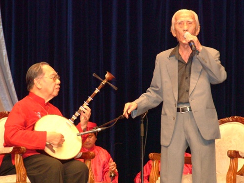 | GS.Trần Văn Khê đệm đàn cho soạn giả Viễn Châu. Ảnh: Thanh Hiệp |