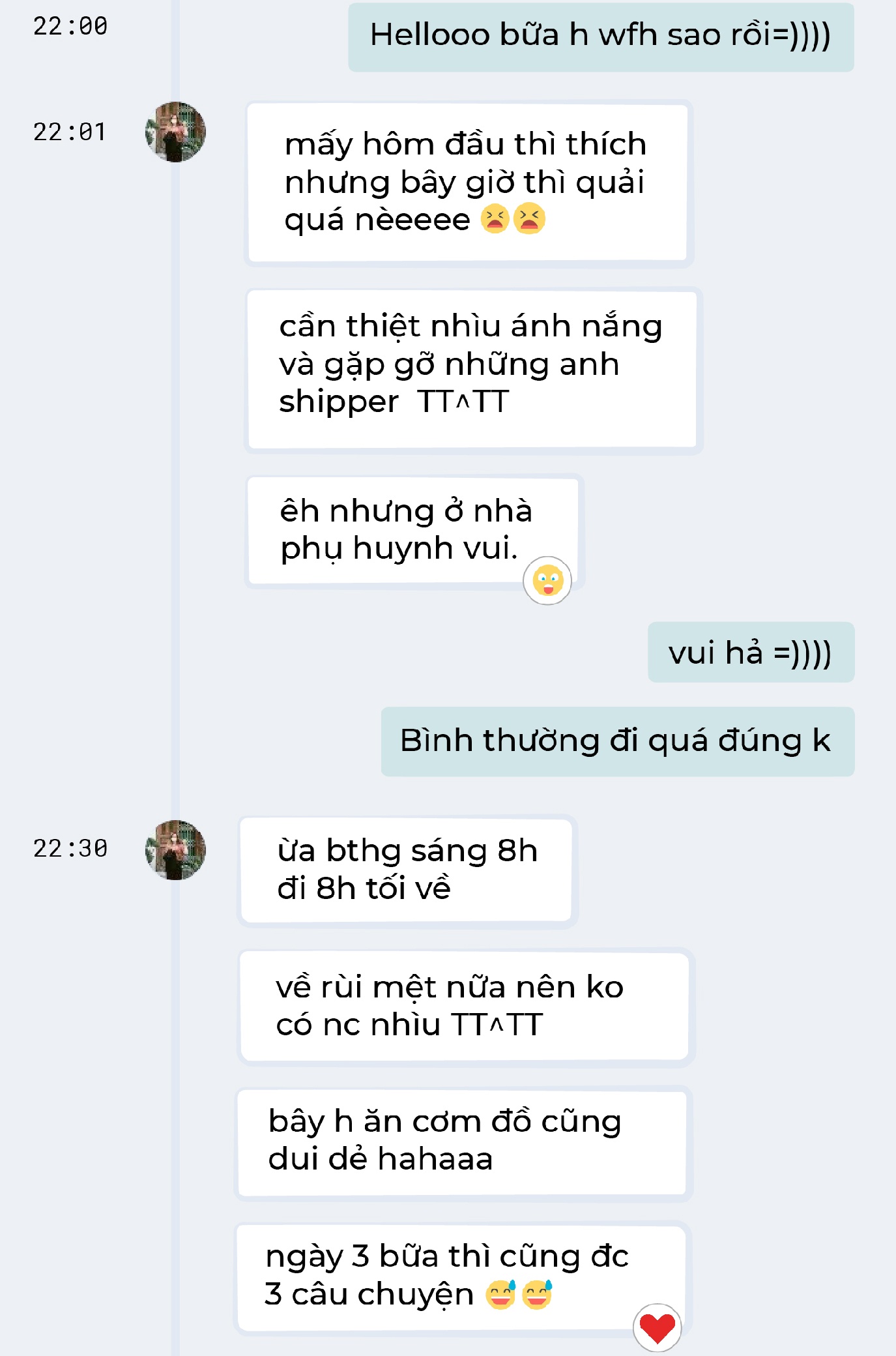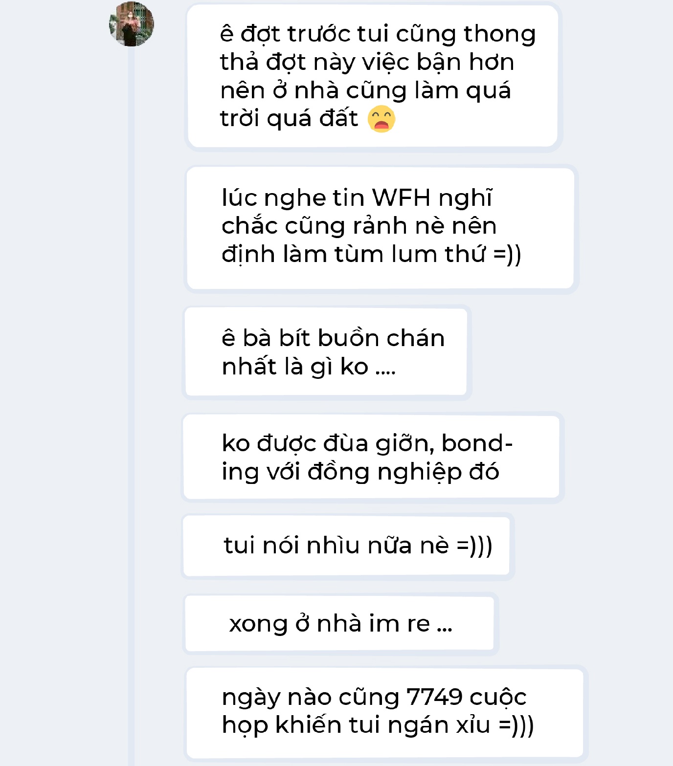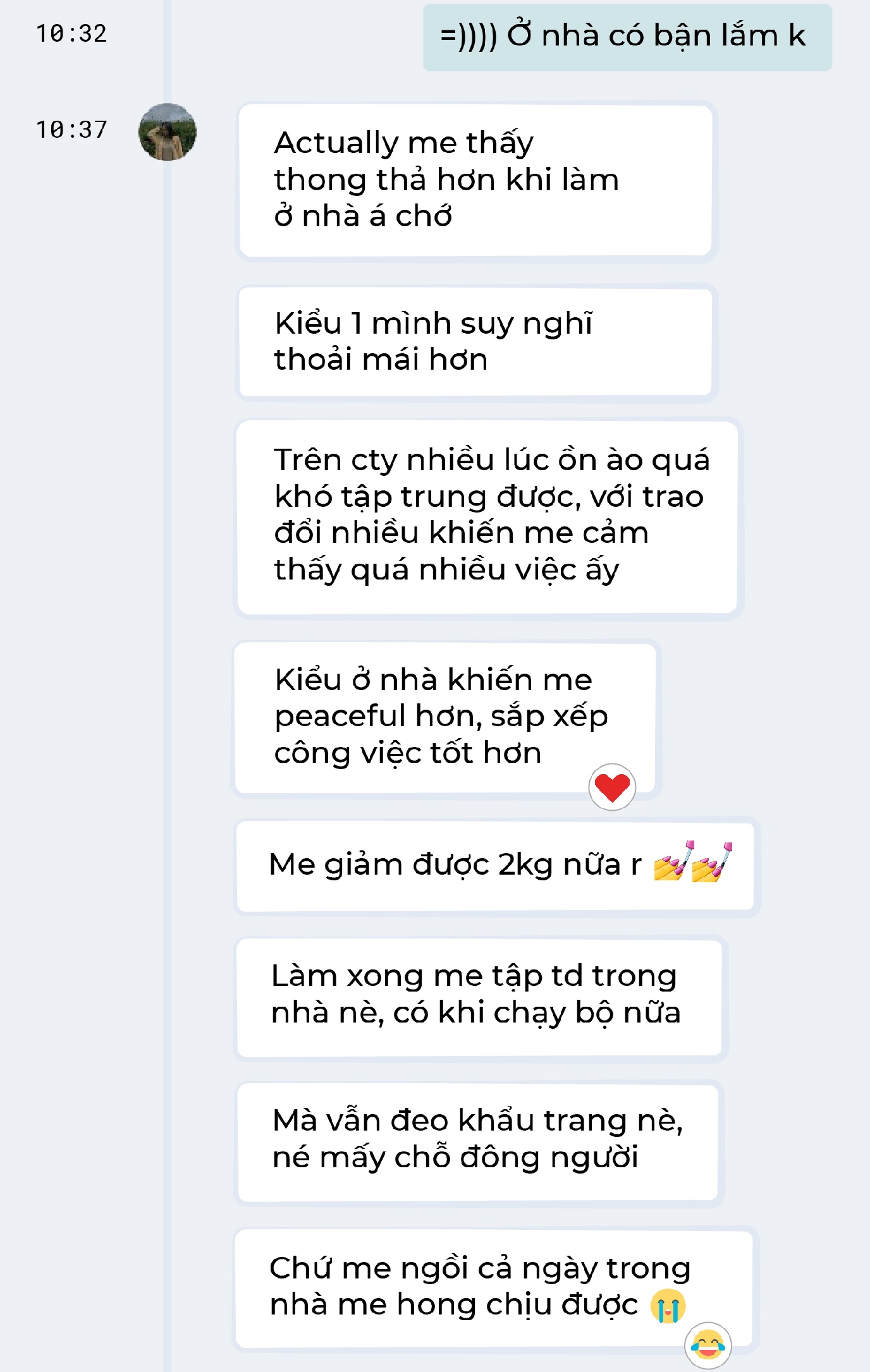 Đầu tiên, tôi nhắn cho Lam Giang - cô bạn nhà ở Quận 5. Trước khi TP.HCM có thông báo giãn cách, công ty Giang đã cho nhân viên làm việc tại nhà.