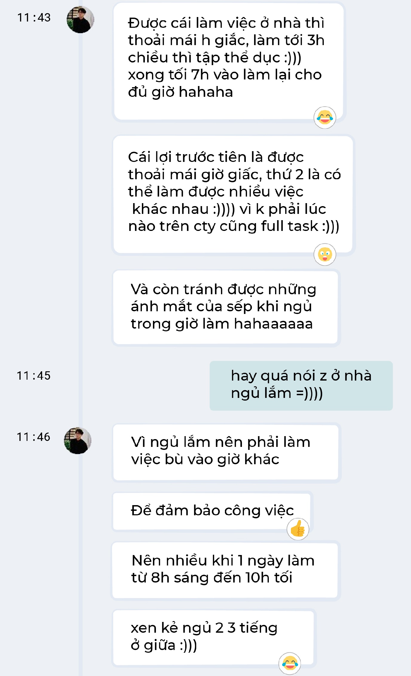 Khi work from home không còn là chuyện ngày một, ngày hai mà trở thành một phần của cuộc sống, Thiên An, Phú Nhuận, chọn cân đối sinh hoạt bằng cách linh động thời gian. Nếu trong ngày chưa hoàn thành task vì ngủ quên hay bận việc riêng, An sẽ làm bù vào buổi tối, miễn là xong việc.