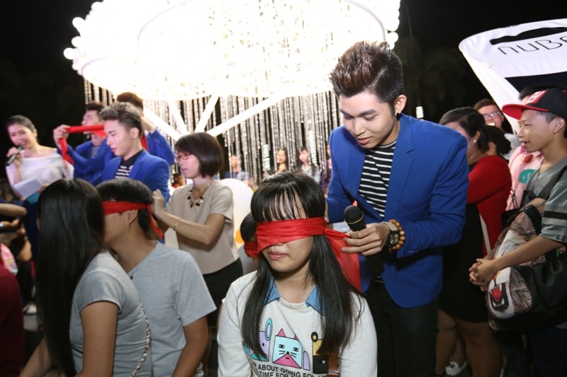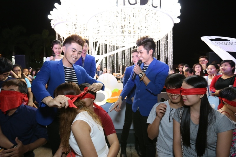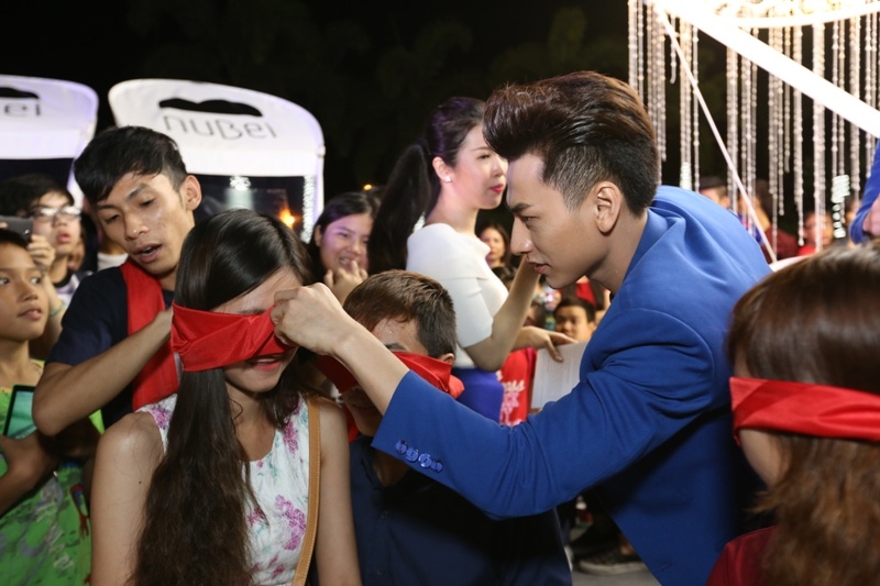 Không chỉ thể hiện các ca khúc sở trường, các thành viên nhóm nhạc nam hot nhất hiện nay còn tham gia các trò chơi cùng khán giả. Trong ảnh, trưởng nhóm Issac hỗ trợ các bạn trẻ bịt mắt, chuẩn bị cho một trò chơi đố vui.
