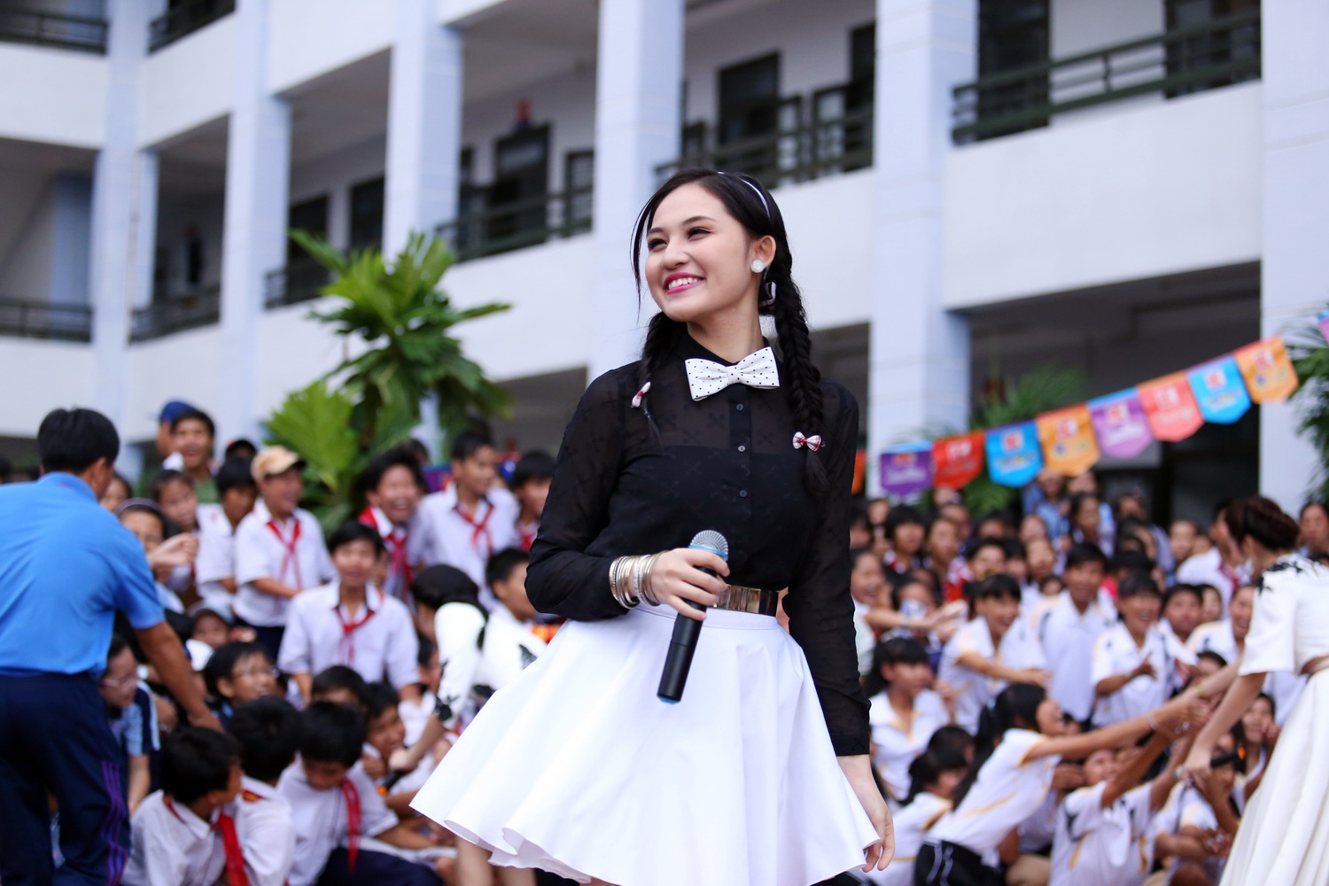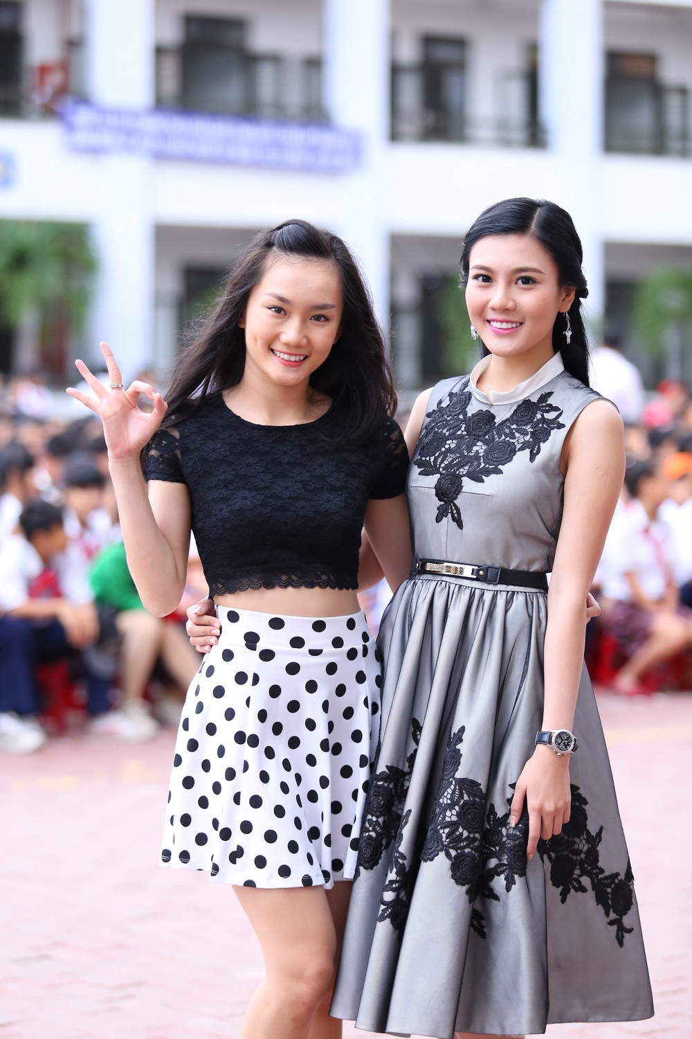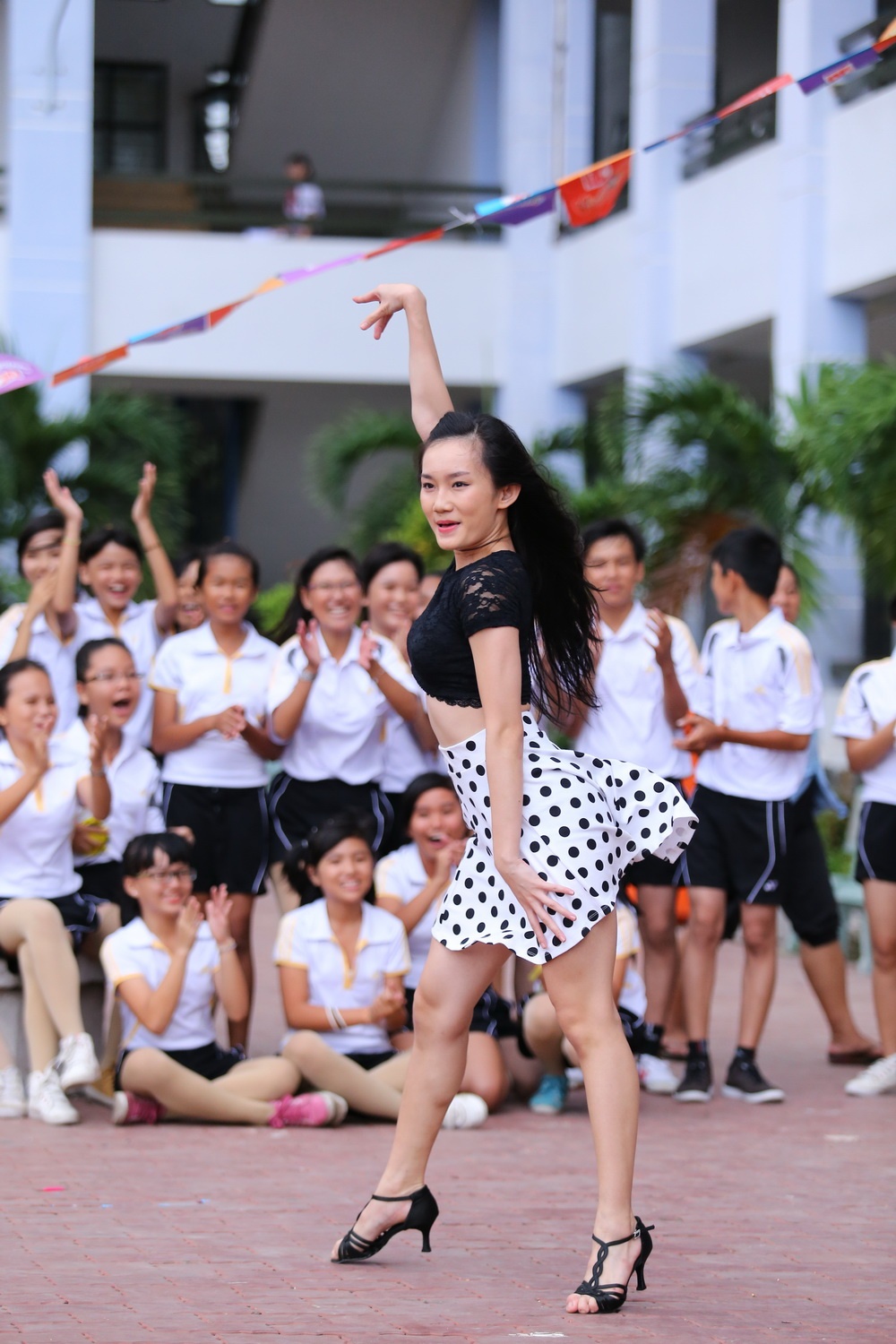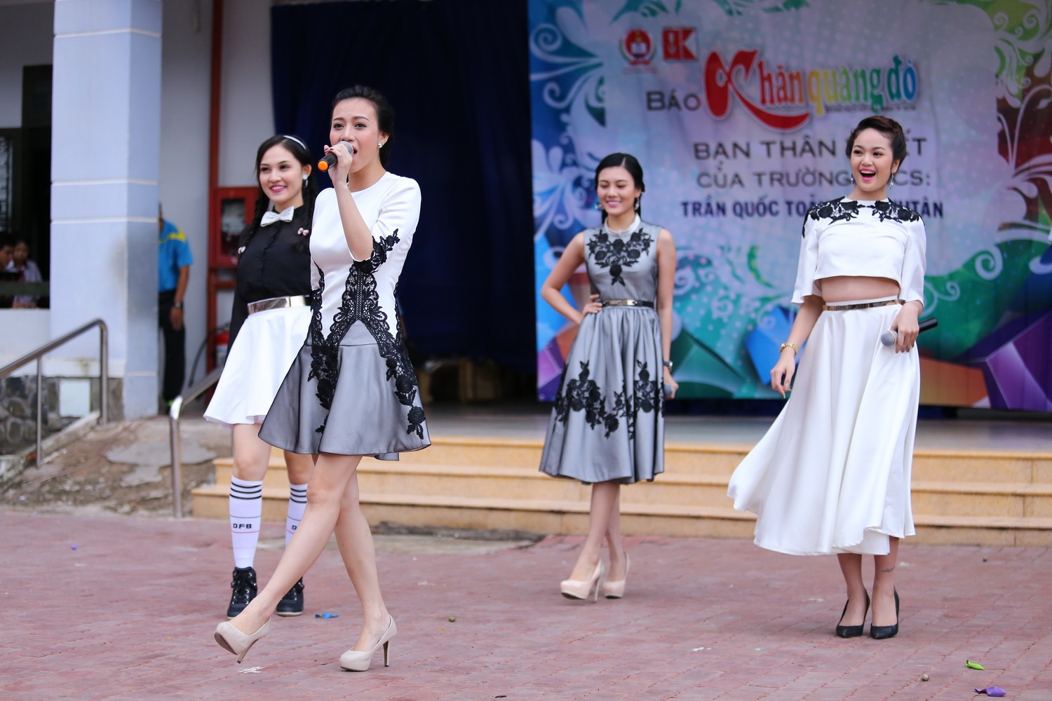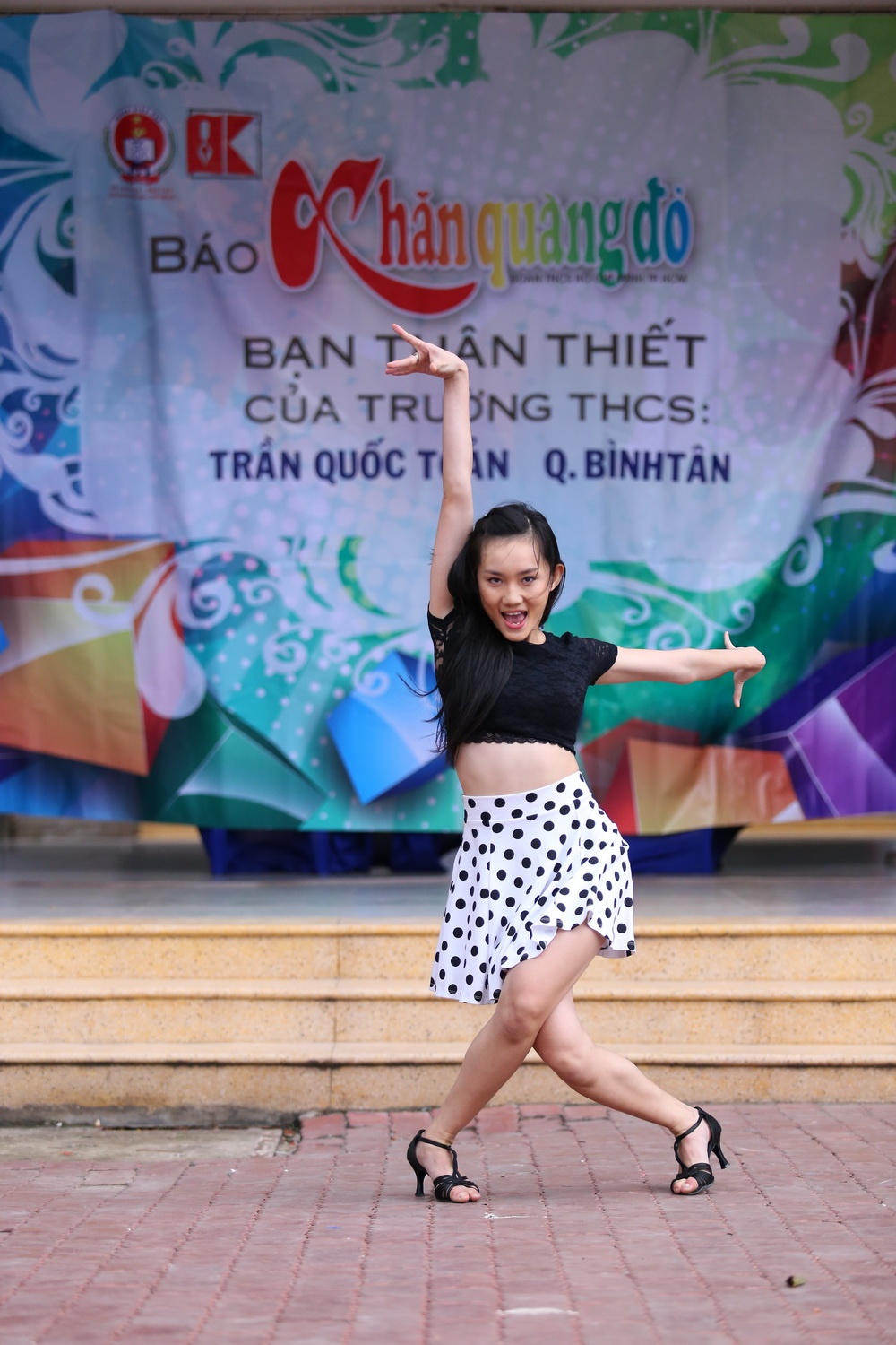 | Mỹ An (bên trái) đang tham dự chung kết cuộc thi Thử thách cùng bước nhảy. Dù khá bận rộn với lịch luyện tập nhưng cô rất phấn khởi khi nhận được lời tham gia biễu diễn giao lưu cùng các bạn học sinh. |