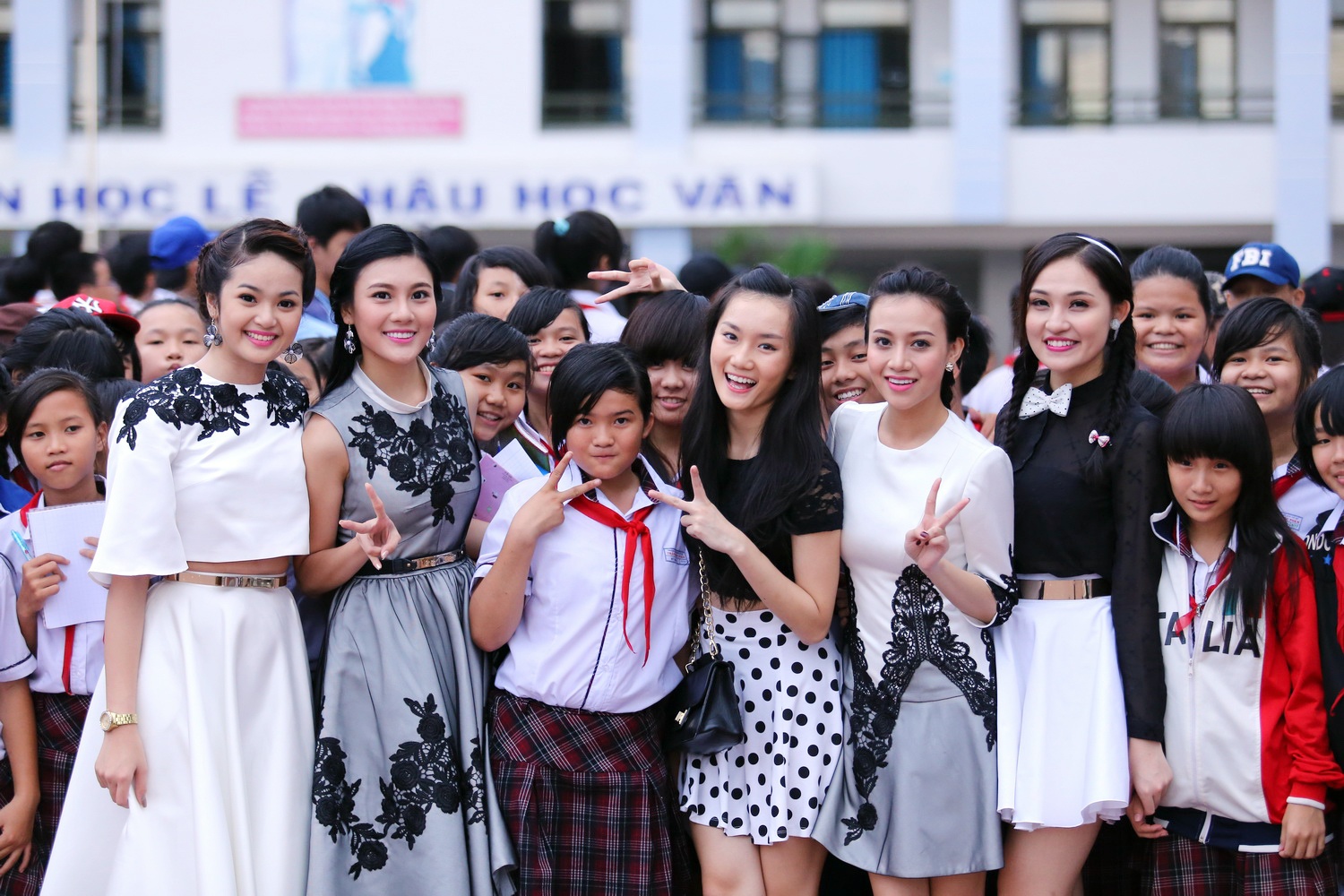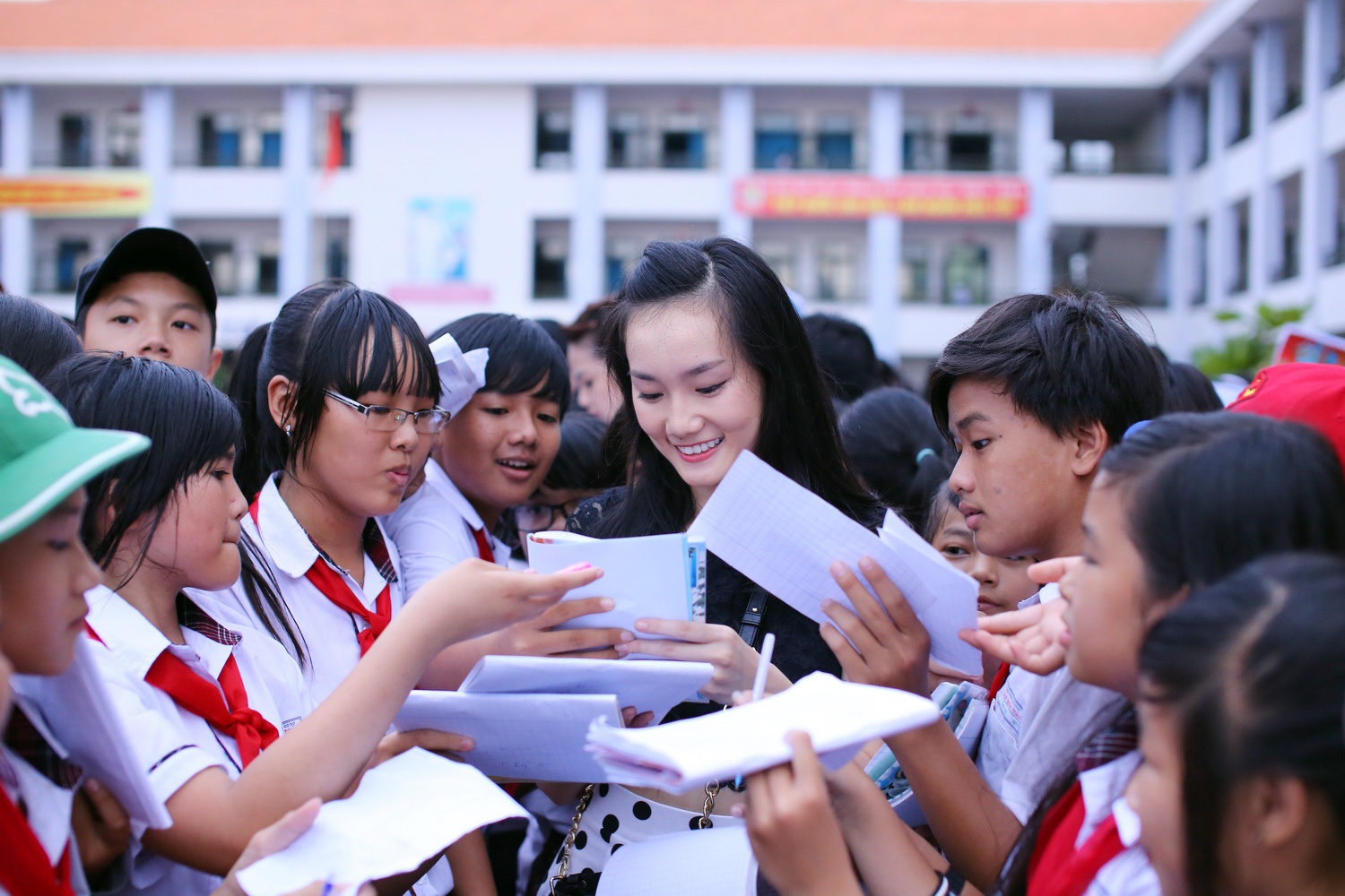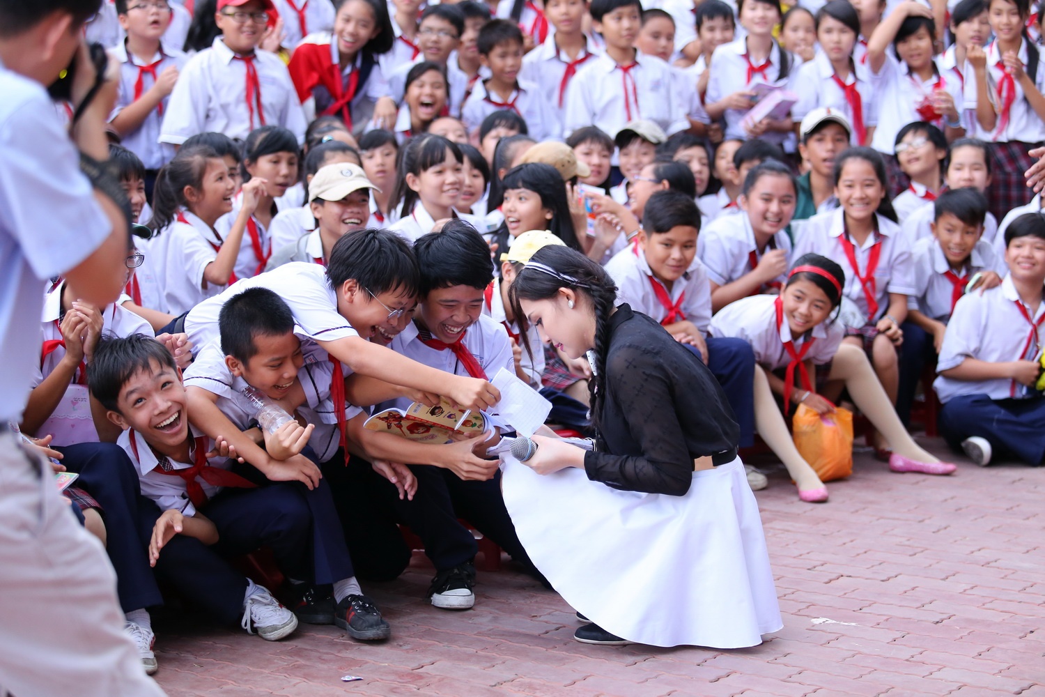 | Các bạn học sinh rất dễ thương và hồn nhiên đã làm cho Mỹ An và nhóm TVM rất xúc động. Đây chính là động lực để các cô gái thích thú được tham gia biễu diễn và giao lưu trong những chương trình tại các trường học. |