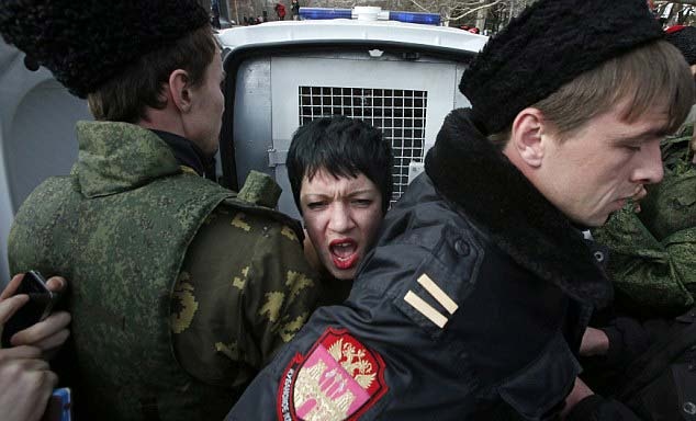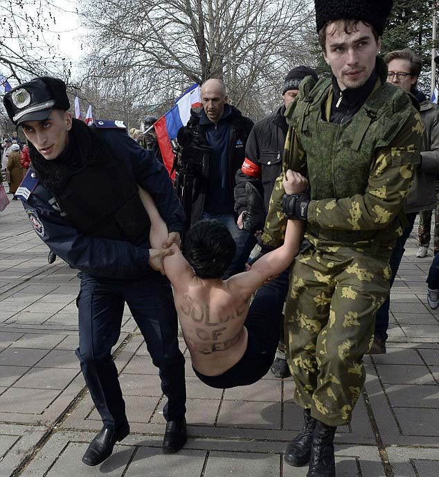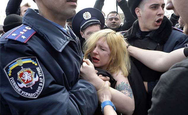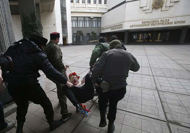 | Một thành viên nhóm Femen bị lôi đi. Ngày 5/3, một quan chức Ukraina cáo buộc hải quân Nga vừa đánh chìm một tàu chống ngầm để làm chướng ngại vật, ngăn các tàu chiến Ukraina rời khỏi căn cứ. Ảnh: Reuters. |