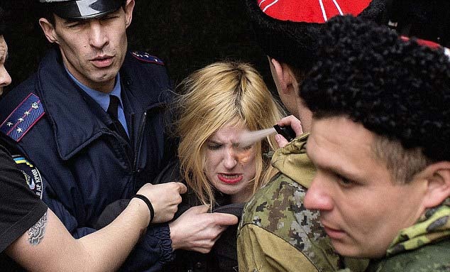 | Hai nhóm lực lượng xịt hơi cay vào thành viên nhóm Femen. Ảnh: AP. |