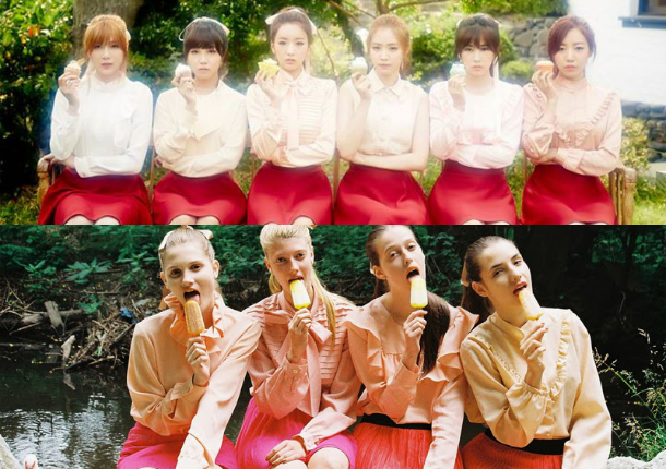Loạt ảnh của A Pink và Michal Pudelka có khá nhiều điểm tương đồng, từ màu sắc trang phục, kiểu tóc, bối cảnh cho đến cách tạo dáng.