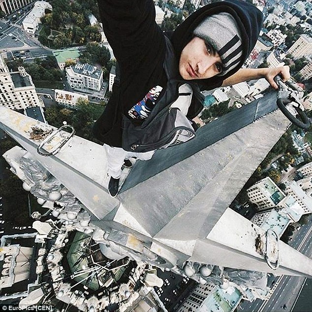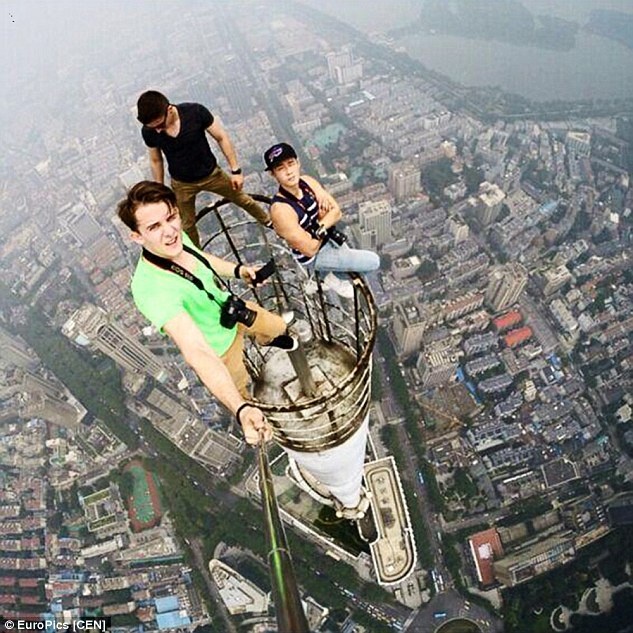 | Vladimir Sidorov, Ivan Kuznetsov (Nga) và Dennis Liu (Hong Kong) chụp ảnh trên nóc của tòa tháp Zifeng cao 450 m ở thành phố Nam Kinh, tỉnh Giang Tô. Ba thanh niên ưa mạo hiểm không sử dụng thiết bị hỗ trợ hoặc bảo hộ khi trèo lên ngọn tháp, Daily Mail đưa tin hôm 3/8. |