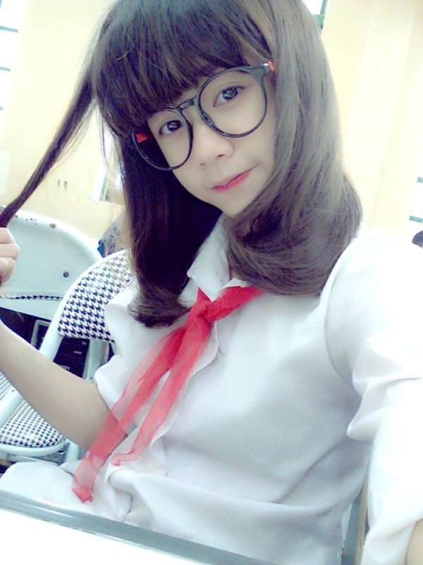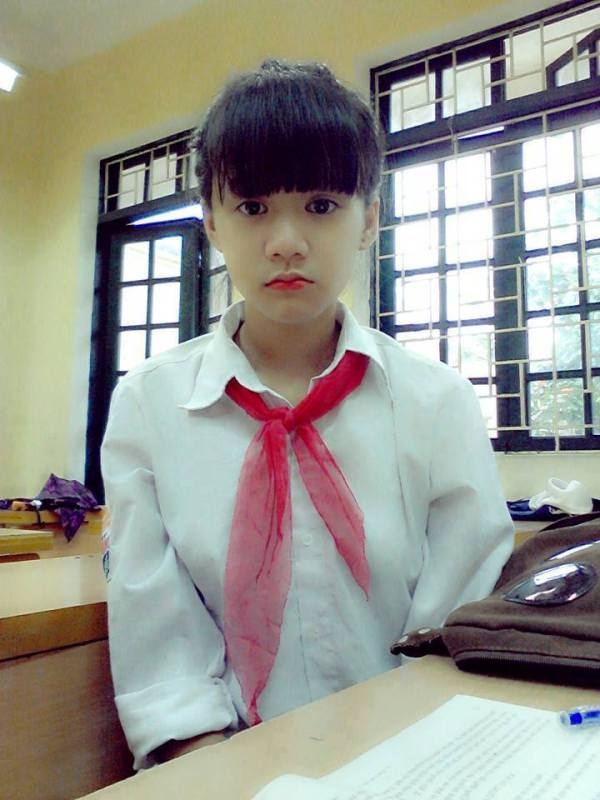 | Kiểu Oanh thường xuyên đăng tải những tấm ảnh cô mặc đồng phục, áo trắng quần xanh, khăn quàng đỏ chỉnh tề cùng gương mặt ngây thơ đốn tim dân mạng. |