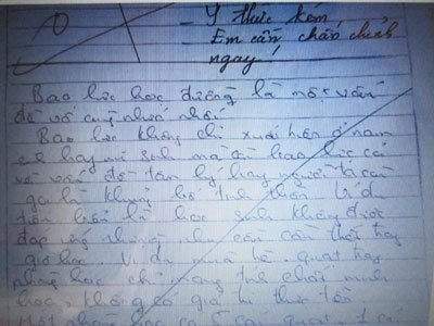 Tuy bài văn của nam sinh này chỉ được chụp lại trang đầu tiên, nhưng có thể thấy khá nhiều từ tục, lời lẽ tự do, thoải mái. Vì thế, bài văn đã nhận điểm 0 cùng lời phê: “Cần xem lại đạo đức bản thân” của giáo viên.
