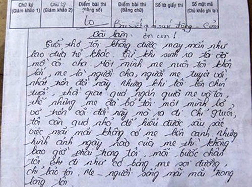 Trong kỳ thi môn Ngữ văn lớp 6 năm 2003 của trường THCS Lý Nhật Quang (thị trấn Đô Lương, Nghệ An) cô giáo chủ nhiệm đã ra đề thi như sau: “Em hãy kể về người mẹ kính yêu”.