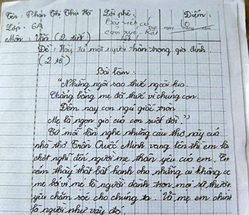 Phạm Thị Thu Hà, một học sinh lớp 6, đã có bài văn xúc động đạt điểm tối đa, cùng với lời nhận xét “Bài viết có cảm xúc, rất tốt".