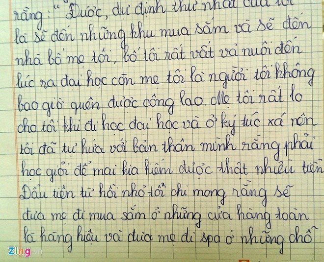Cô phóng viên đấy liền hỏi tiếp: “Đó là những dự định nào? Bạn có thể cho chúng tôi biết được không?”. Em trả lời rằng: “Được, dự định thứ nhất của tôi là sẽ đến những khu mua sắm và sẽ đến nhà bố mẹ tôi, bố tôi rất vất vả nuôi đến lúc ra đại học còn mẹ tôi là người tôi không bao giờ quên được công lao. Mẹ tôi rất lo cho tôi khi đi học đại học và ở ký túc xá nên tôi tự hứa với bản thân mình rằng phải học giỏi để mai kia kiếm được thật nhiều tiền.