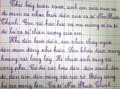 Còn Nguyễn Hiền Anh (lớp 5A, trường tiểu học Quang Trung, Hà Nội) lại miêu tả Noo Phước Thịnh: "Thứ bảy tuần trước, anh em vừa mua vé đi xem ca nhạc buổi biểu diễn của ca sĩ Noo Phước Thịnh. Em rất háo hức và vui mừng vì ca sĩ đó là thần tượng của em. Khi đến buổi biểu diễn, em nhìn thấy người đến xem đông như kiến. Sân khấu được trang hoàng rất lộng lẫy. Kĩ thuật ánh sáng rất công phu. Có đủ các loại đèn: đèn xanh, đèn đỏ, đèn tím, đèn vàng rất rực rỡ. Bỗng tiếng hò reo vang lên. Ca sĩ Noo Phước Thịnh bước lên sân khấu.