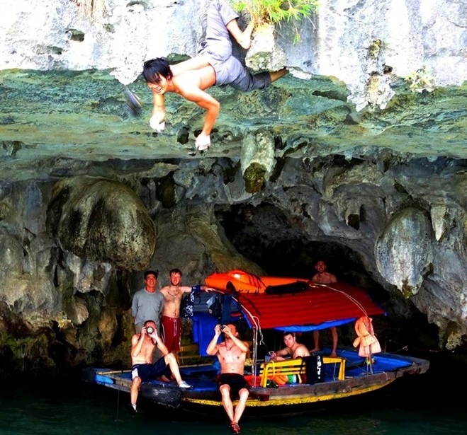 | Du khách nước ngoài thích thú trước màn trình diễn của "người nhện". Đoạn video ghi lại cảnh Vũ leo qua những dãy núi cao bằng tay không được lan truyền rộng rãi trên mạng, thu hút gần 80.000 lượt xem. Ảnh: NVCC. |