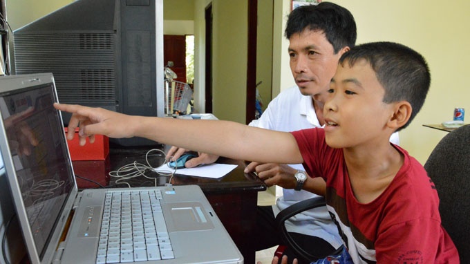 | Nguyễn Minh Nhựt cùng cha chơi trò chơi phòng học thông minh. Ảnh: Ngọc Tài. |
