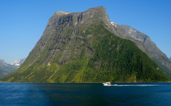 Hjørundfjord là một vịnh hẹp mang một vẻ đẹp tự nhiên hoàn mỹ với những đỉnh núi hùng vỹ màu ngọc lục, xung quanh là nhiều tàu lớn nhỏ.