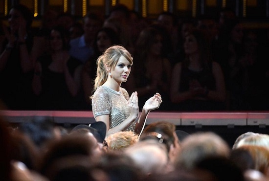 | Taylor Swift nổi bật giữa đám đông khi là người đầu tiên đứng lên. |