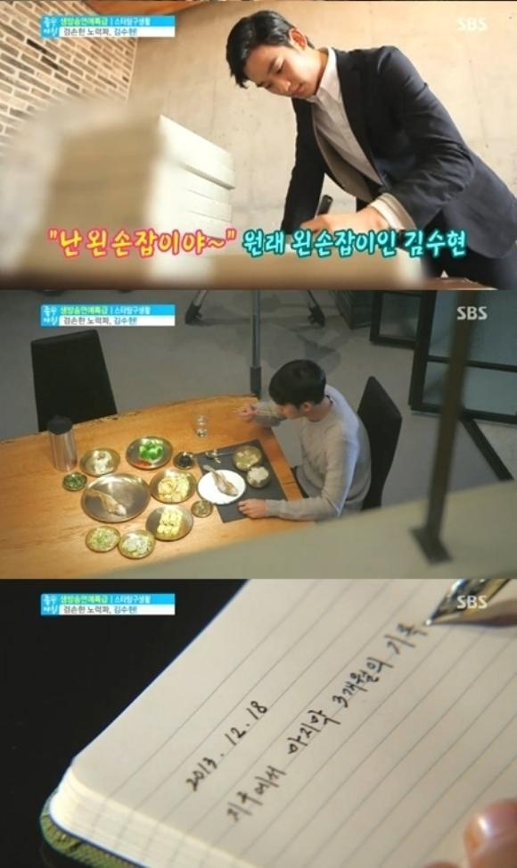 Được biết, đầu tiên anh tập cầm đũa bằng tay phải. Sau khoảng thời gian đổ mồ hôi, những cảnh ăn uống của anh chàng với việc sử sụng tay phải đã làm ngạc nhiên đoàn phim và bạn diễn. Đến cảnh giáo sư Do Min Joon viết bằng tay phải trong Man from the stars, người xem không thể nhận ra rằng anh không thực sự thuận tay phải. Tất cả là kết quả của nỗ lực vượt khó và những lần toát mồ hôi trong nhiều tháng khi tập diễn của Kim Soo Hyun.