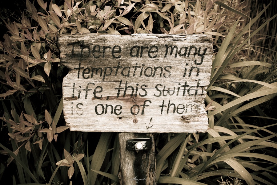 | "Trên đời có nhiều cám dỗ, một trong số đó là cái công tắc này". Nếu không có biển báo thì chắc chẳng ai chú ý đến cái công tắc, sự xuất hiện của dòng chữ cảnh báo chỉ khiến người ta càng thêm tò mò và muốn bấm thử xem chuyện gì sẽ xảy ra. |