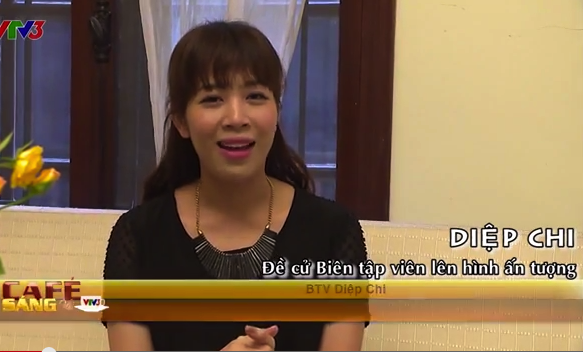 | BTV Diệp Chi: Ngoài những BTV kỳ cựu, MC chương trình thời sự, một số gương mặt trẻ cũng để lại dấu ấn đẹp, được đông đảo khán giả yêu mến và đang có mặt trong danh sách đề cử những BTV lên sóng ấn tượng nhất, Diệp Chi là một trong số đó. BTV 8X để lại ấn tượng trong lòng công chúng với vai trò biên tập viên, người dẫn chương trình của Rung chuông vàng – gameshow nổi tiếng dành cho sinh viên của VTV3. Với lối dẫn tự nhiên, thông minh và rất có duyên cùng với gương mặt xinh xắn, nụ cười tươi tắn, Diệp Chi dễ chiếm thiện cảm của người xem. |