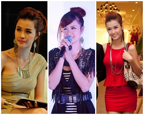 | Cách dùng phụ kiện của cô cũng bị chê là sến sẩm, Đông Nhi thường chọn kiểu bông tai dáng dài, kết hợp cùng trang phục có nhiều họa tiết rườm rà. |