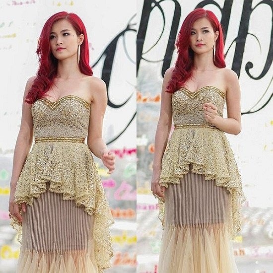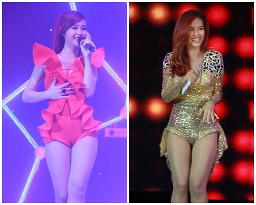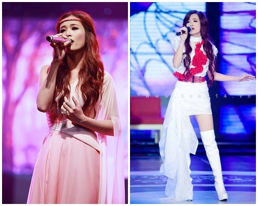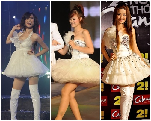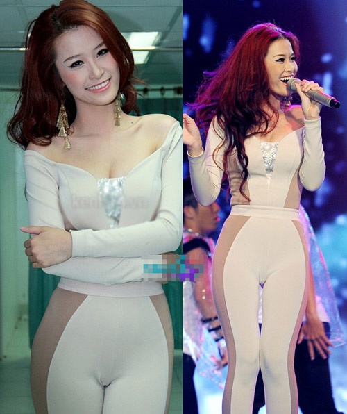 | Trên một sân khấu âm nhạc vào năm ngoái, giọng ca 'Khóc' chọn phong cách thời trang nữ thần. Bộ trang phục không được đánh giá cao do thiết kế váy thiếu sự hoàn hảo, bộ váy cũng dễ dàng khiến cô gặp nguy với việc "lộ hàng" trên sân khấu. |