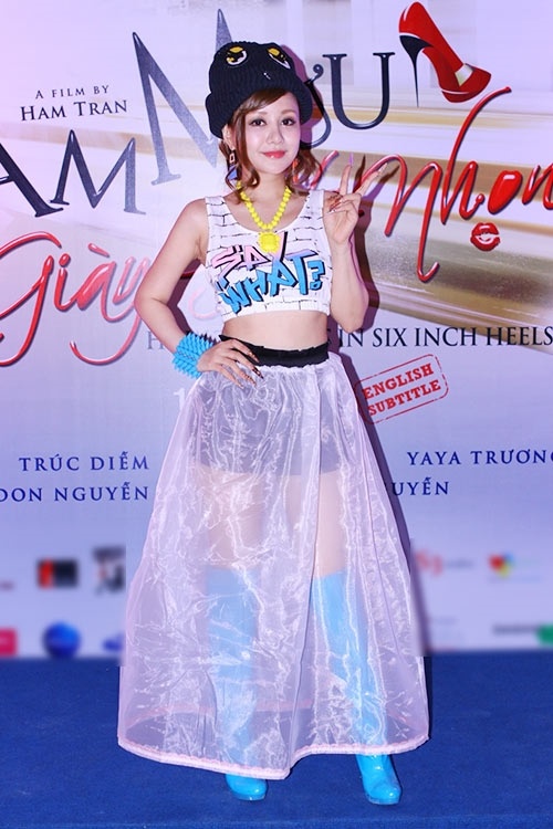 | Học hỏi theo đàn chị, Khanh Chi Lâm cũng chọn style khá "dị" cùng váy xuyên thấu ánh kim, chiếc mũ đội lệch thừa thãi cùng nước son đỏ chói lọi. |