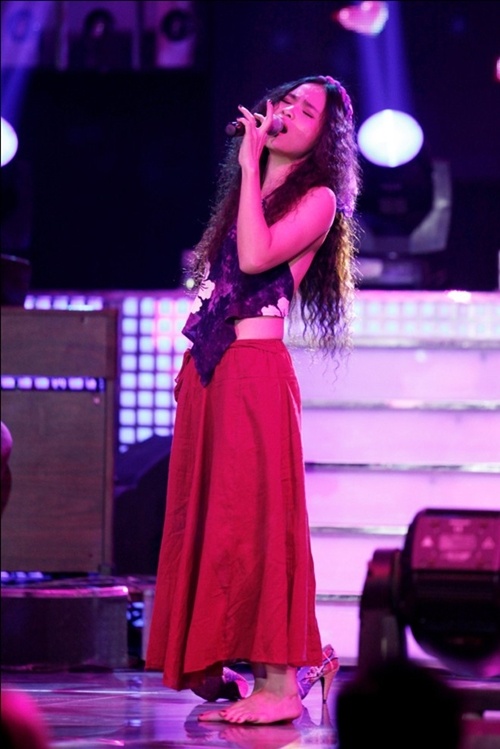 | Lều Phương Anh biến hóa thành bông hoa di động với chiếc váy kì lạ và bờm tóc tua rua. |