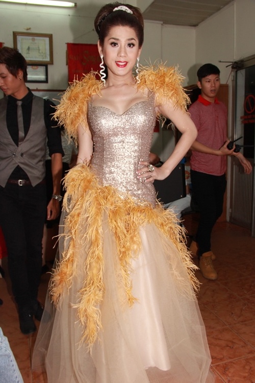 | Tuy nhiên, diễn đạt vai này nhất phải kể đến công "hóa trang" của Khánh Ngọc với bộ tóc bạch kim cùng bộ đồ bó sát gắn đá màu và ánh vàng. |
