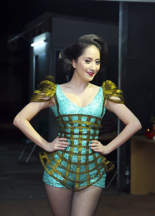 | Khánh Thi cũng chuộng lối trang phục "người ngoài hành tinh" với bộ khung rườm rà mặc ngoài jumpsuit lấp lánh. |