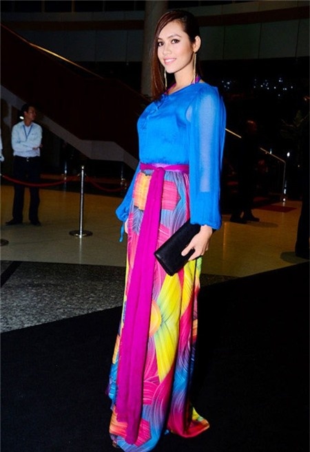 | Á hậu Hoàng My cũng nằm trong list kiều nữ mắc sai lầm khi chọn trang phục lỗi thời. Xuất hiện cạnh gia đình bạn trai Phillip Nguyễn, người đẹp trở nên lạc lõng vì bộ váy nhiều màu trông giống với trang phục trình diễn hơn là váy áo thời trang dự sự kiện. Bộ cánh diêm dúa nhanh chóng lọt nhiều bình chọn trang phục xấu nhất năm 2012. |
