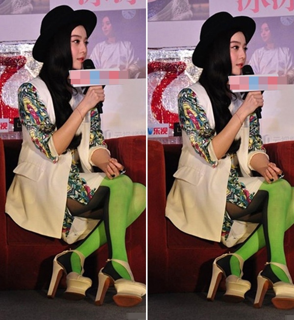 | Phạm Băng Băng kém sang trọng trong set đồ lòe loẹt gồm tất hai màu kết hợp váy họa tiết. |