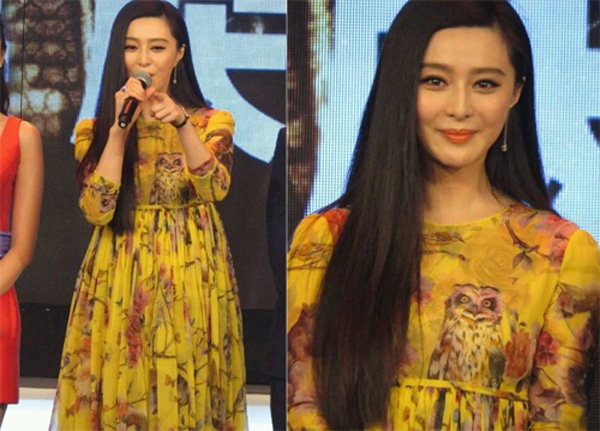 | Phạm Băng Băng như mang bầu với chiếc váy họa tiết rối mắt và ly nhúm kém tinh tế. |