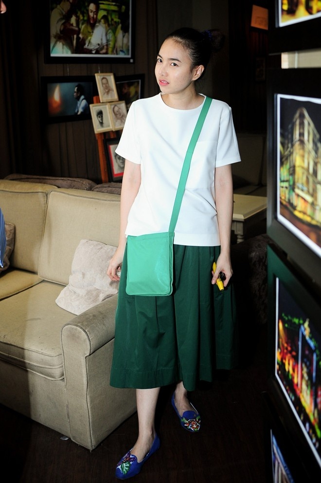 | Trong buổi ra mắt sách ảnh, Đinh Ngọc Diệp khiến cánh truyền thông và người hâm mộ ngỡ ngàng khi xuất hiện với bộ cánh thời trang mặc ở nhà xuề xòa và luộm thuộm. Người đẹp giải thích, cô muốn trông mình gần gũi hơn với khán giá khi giới thiệu vai trò biên tiệp, tác giả của Hào quang – The art of scandal. |