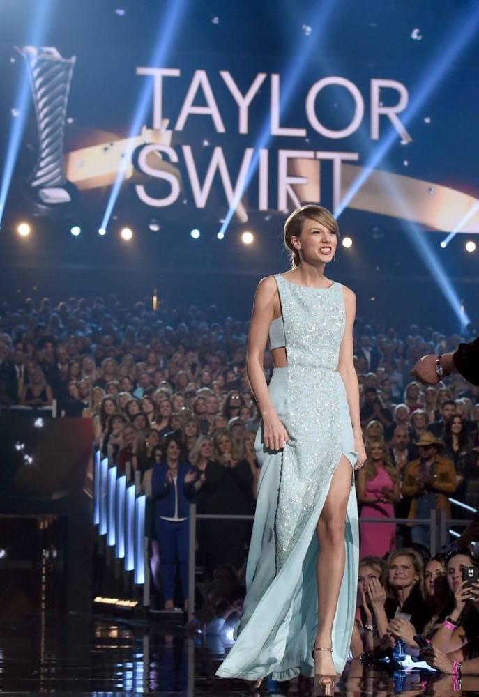 Taylor Swift diện đầm xanh cut-out gợi cảm của Reem Acra tại The American Country Music Awards 2015. |