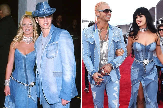 | 2001 & 2014 - Britney Spears & Justin Timberlake và Katy Perry & Riff Raff diện denim đôi: Phong cách denim được bộ đôi đình đám diện trên thảm đỏ của VMA 2001 khiến người hâm mộ phát sốt. 13 năm sau, tới lượt giọng ca của Firework và Riff Raff diện phong cách tương tự. |