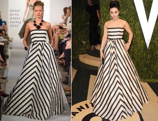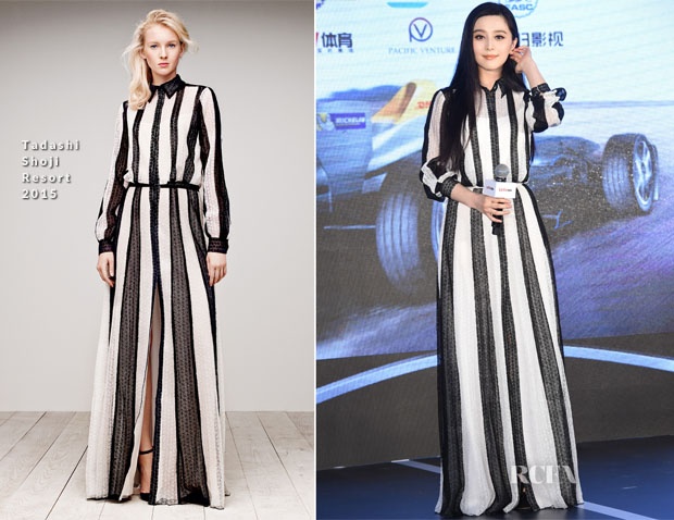 | Mẫu đầm kẻ đen trắng của Tadashi Shoji dường như phù hợp với vóc người của Phạm Băng Băng hơn là vóc dáng mình dây của siêu mẫu. |