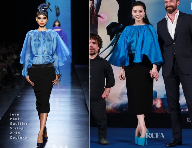 | Với mẫu trang phục của Jean Paul Gauitier, thay vì lộ thắt lưng mảnh mai, Phạm Băng Băng chọn cách cắm thùng với váy bút chì để tăng vẻ thanh lịch. |