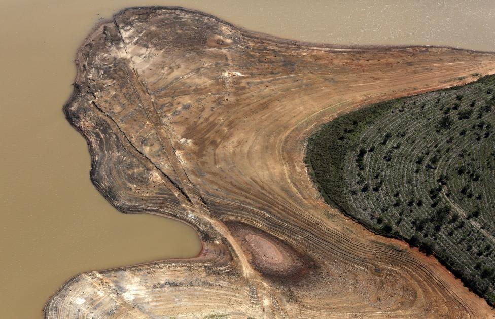 Khung cảnh nhìn từ trên cao của đập Atibainha, một phần của hồ chứa Cantareira, trong một đợt hạn hán ở vùng Nazare Paulista, bang Sao Paulo, Brazil. Tình trạng biến đổi khí hậu và nóng lên toàn cầu đã khiến cho hồ chứa chuyên cung cấp nước cho thành phố lớn nhất Nam Mỹ đang ở mức thấp nhất trong hàng thập kỷ.