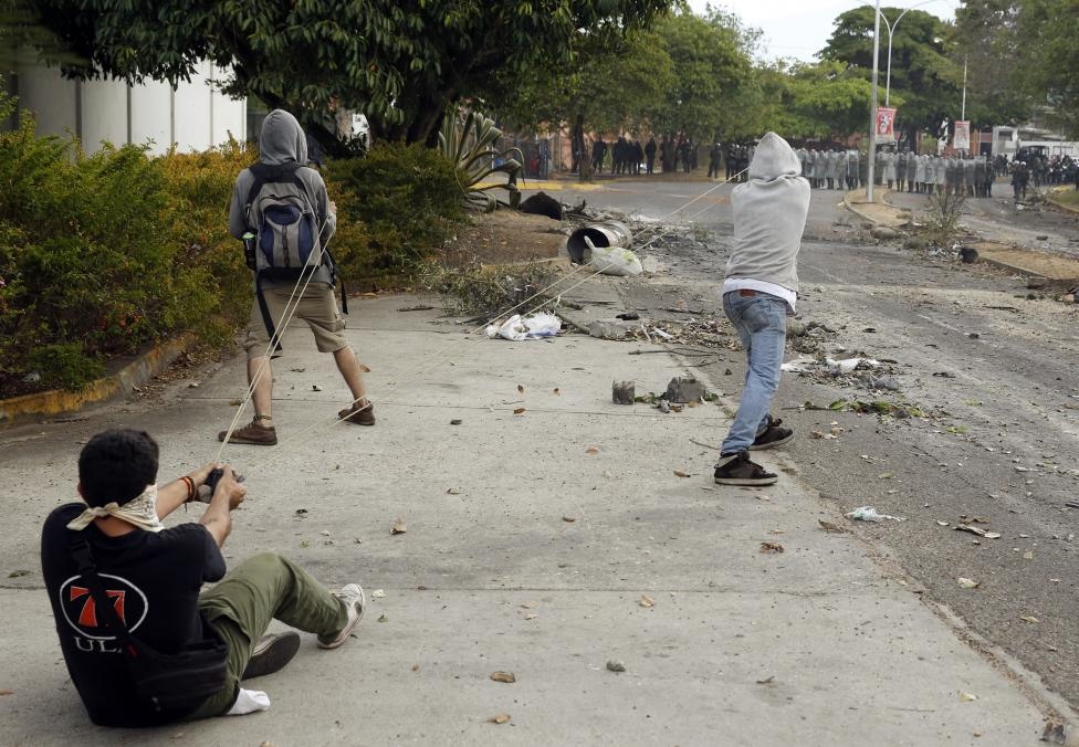 Những người phản đối chính quyền đang bắn đá vào lực lượng Bảo vệ Quốc gia trong một cuộc biểu tình tại thành phố San Cristobal, Venezuela, ngày 27/2. Người dân, chủ yếu là sinh viên và người trẻ tuổi, đã chán nản tình trạng tội ác, bạo lực ngày càng gia tăng, lạm phát cao và sự thiếu thốn các mặt hàng thiết yếu.