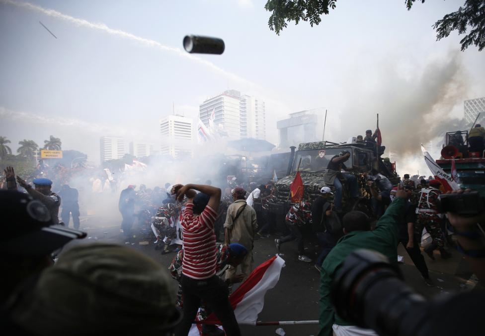 | Cảnh sát xịt hơi cay và phun nước nhằm ngăn cản những người ủng hộ ứng cử viên Tổng thống Prabowo Subianto tại thủ đô Jakarta, Indonesia, ngày 21/8. Trước đó, ông Subianto đã đệ đơn kiện vì nghi ngờ gian lận trong cuộc bầu cử ngày 19/7. Tuy nhiên, tòa án đã bác bỏ và giữ nguyên kết quả. |