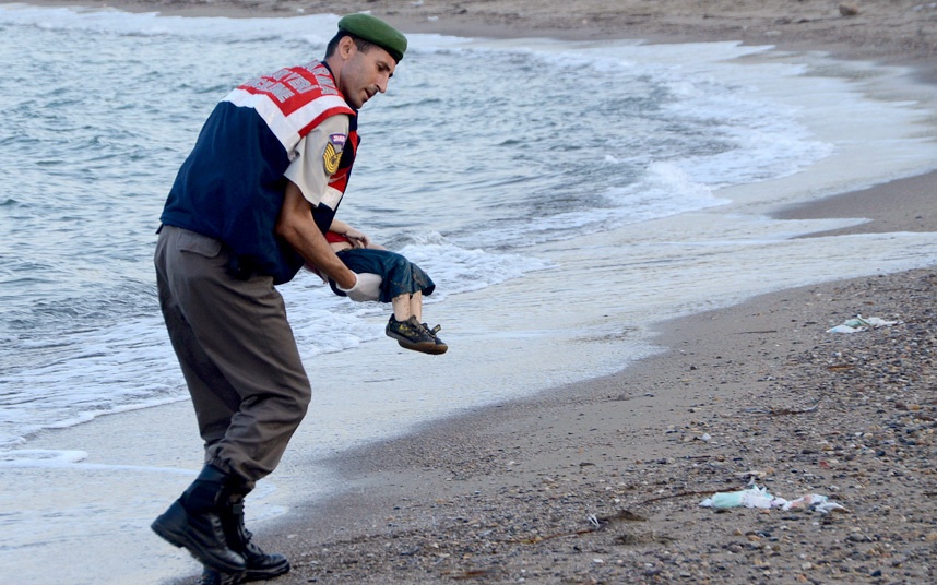 | Bức ảnh chụp một cảnh sát Thổ Nhĩ Kỳ bế thi thể bé trai tị nạn Aylan Kurdi đã trở thành chất xúc tác khiến cả thế giới không thể ngoảnh mặt với cuộc khủng hoảng nhập cư và tị nạn ở châu Âu. Hàng triệu người cùng chung cảm xúc khi chứng kiến bức ảnh lột tả thực tế nghiệt ngã của người tị nạn Syria. "Khi tôi không thể cứu sống cậu bé, tôi nghĩ mình phải cho cả thế giới thấy cảnh tượng kinh hoàng ấy. Tôi hy vọng bức ảnh sẽ thức tỉnh mọi người", Nilufer Demir, tác giả của tấm hình, chia sẻ. Ảnh: Getty