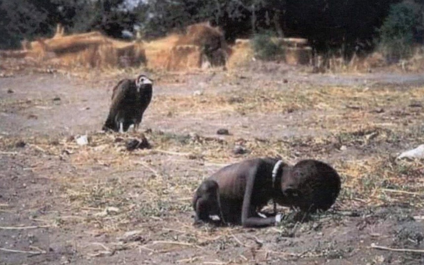 | Tháng 3/1993, trong chuyến đi tới Sudan, phóng viên Nam Phi Kevin Carter gặp cảnh một bé trai gục xuống đất vì kiệt sức khi đang trên đường tới khu vực phát đồ ăn của Liên Hợp Quốc. Một con kền kền đậu ngay sau lưng cậu. Bức hình đầy ám ảnh phản ánh nạn đói khủng khiếp hoành hành tại đất nước nghèo khó của châu Phi. Giá trị của bức ảnh được khẳng định khi Carter nhận giải thưởng Pulitzer danh giá năm 1994. Ảnh: Telegraph |