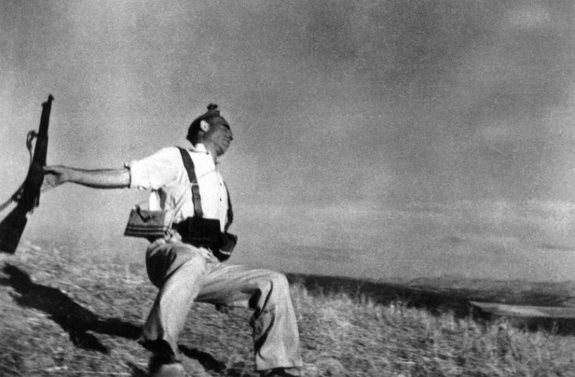 | The Falling Soldier (Người lính gục ngã) là bức ảnh nổi tiếng nhất trong sự nghiệp của nhiếp ảnh gia Robert Capa. Ngày 5/9/1936, Capa ghi lại khoảnh khắc hy sinh của người lính anh dũng trong cuộc nội chiến Tây Ban Nha. Bức ảnh gây xôn xao dư luận khi nó được đăng trên một tạp chí Pháp. Ảnh: MAGNUM |