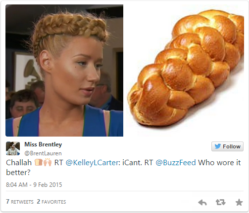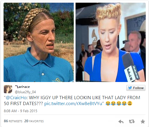 | Vốn không được lòng người hâm mộ vì những phát ngôn phân biệt chủng tộc và scandal lộ ảnh nóng với người yêu cũ nên việc nữ rapper Iggy Azalea bị cư dân mạng chế ảnh tại Grammy 2015 là điều khá dễ hiểu. Mái tóc tết thảm họa của cô đã trở thành nguyên liệu chế cho rất nhiều bức ảnh. |