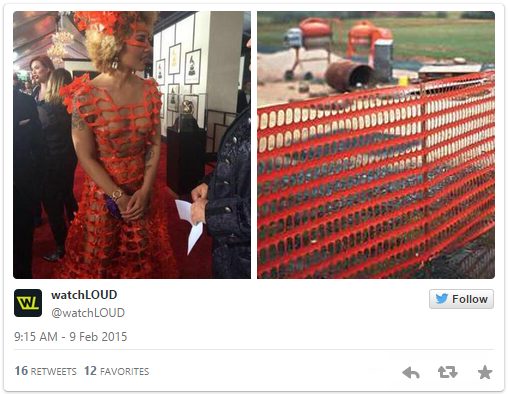 | Nhà thiết kế Andre Soriano mang tới thảm đỏ Grammy một chiếc váy khoe gần trọn cơ thể với chất liệu được người xem đồn đoán rằng lấy từ những tấm lưới bảo vệ quanh công trường xây dựng. |