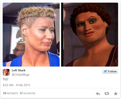 | Ngay khi vừa xuất hiện trên thảm đỏ Iggy Azalea bị so sánh với một nhân vật xấu xí trong phim hoạt hình. |